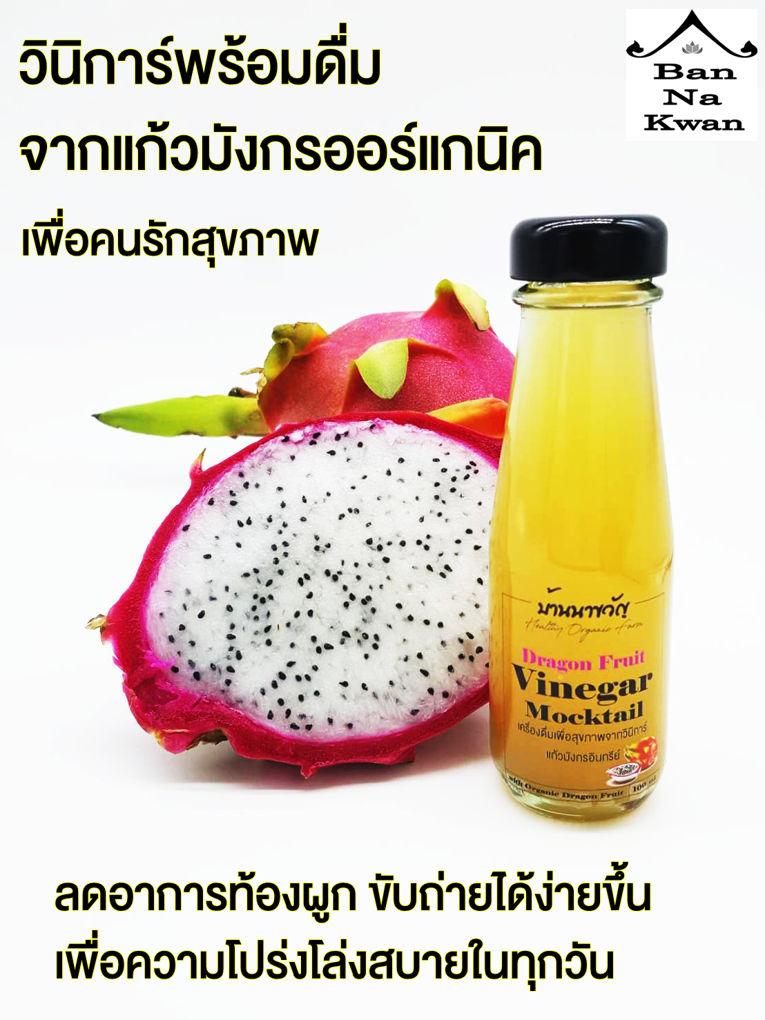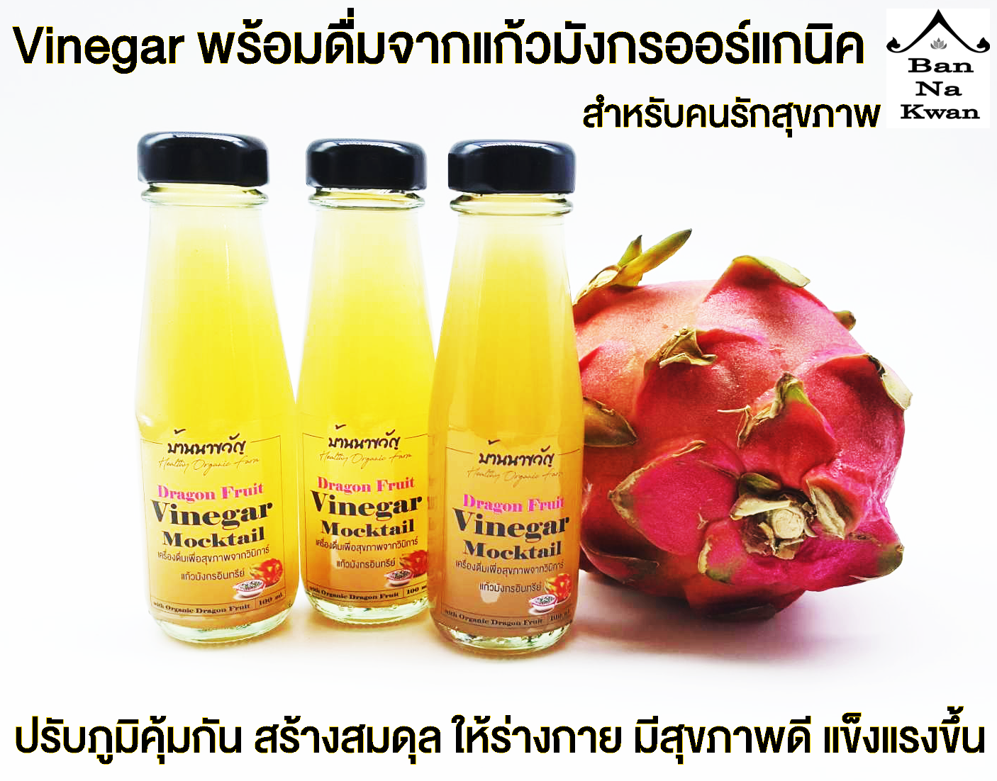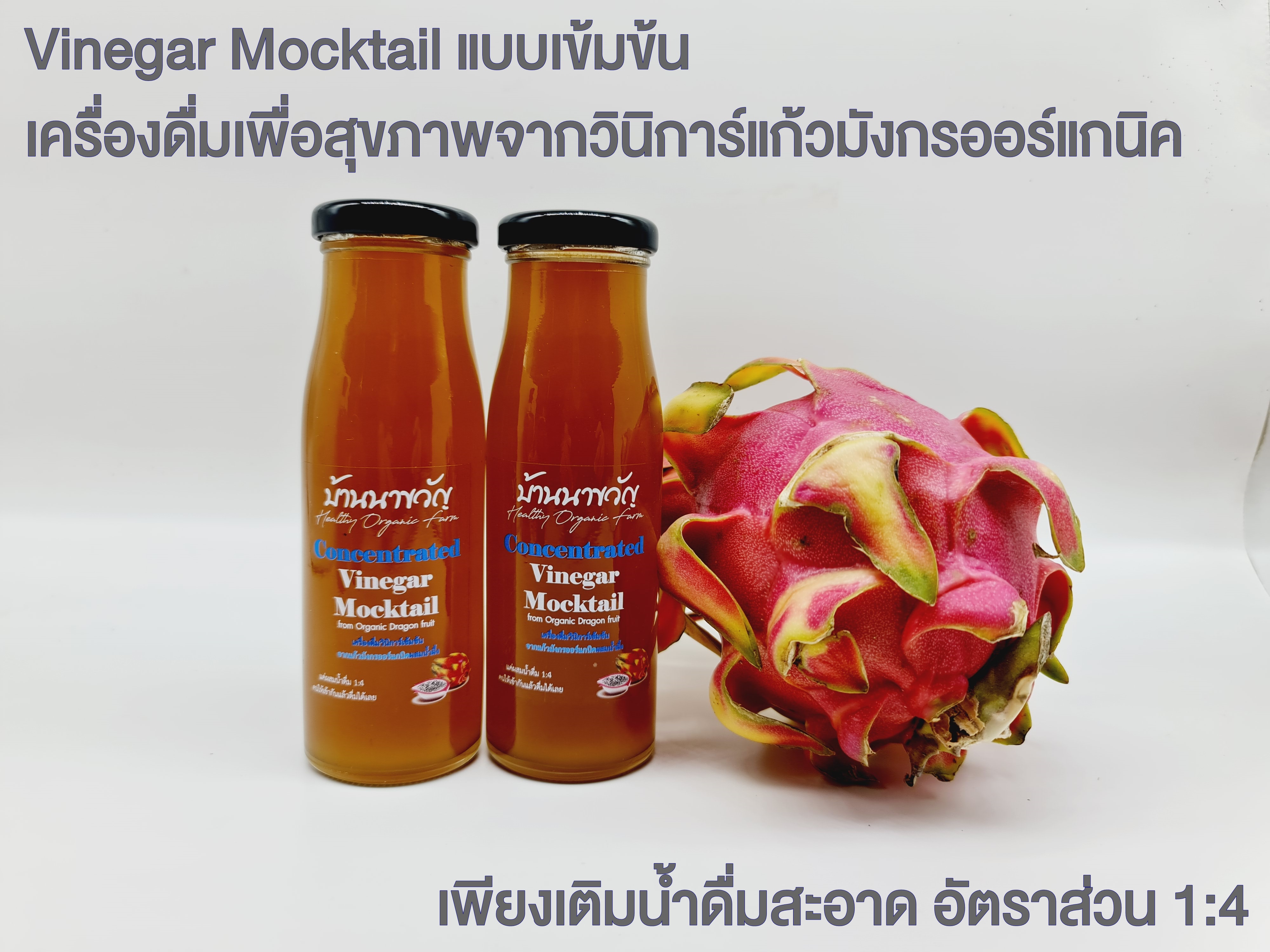 Vinegar Mocktail ซึ่งเป็นเครื่องดื่มเพื่อสุขภาพพร้อมดื่มจากวินิการ์ (Vinegar) แก้วมังกรออร์แกนิค ที่ปรุงรสชาดให้อร่อย เหมาะแก่การแช่เย็น เปิดขวดแล้วดื่มได้เลย โดยไม่ต้องผสมอะไรเพิ่มเติม