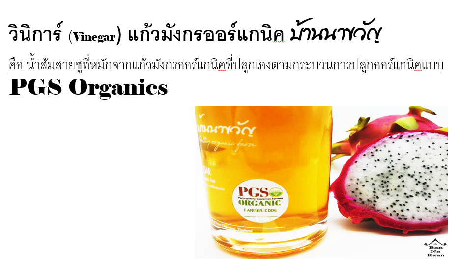 ผลผลิตแรกที่เรานำมาแปรรูป ก็คือ แก้วมังกรออร์แกนิค นำมาแปรรูปเป็น วินิการ์ (Vinegar) ซึ่งหลายๆคนก็คงจะสงสัยว่า "วินิการ์" (Vinegar) คืออะไร บางคนก็เรียกว่า ไซเดอร์ (Cider) ซึ่งคำนี้จะใช้กับการหมักแอ๊ปเปิ้ล (apple) เป็นส่วนมากค่ะ หากว่ากันตามท้องเรื่องไทย วินิการ์หรือไซเดอร์ ก็คือ "น้ำส้มสายชูหมักจากผลไม้" ซึ่งใครๆก็มักจะคิดว่า ป้าเช็งแน่ๆเลย อย่าเข้าใจผิดนะคร้า วิถีแบบป้าเช็งถ้าทำสะอาด ก็ถือว่าใช้ได้ค่ะ แต่ว่าวิธีการทำวินิการ์ (How to make Vinegar) ของเราแตกต่างออกไปค่ะ มีกระบวนการ มีการควบคุม มีการทดสอบค่า มีมาตราฐาน จนได้รับเลขอย.กำกับคือ