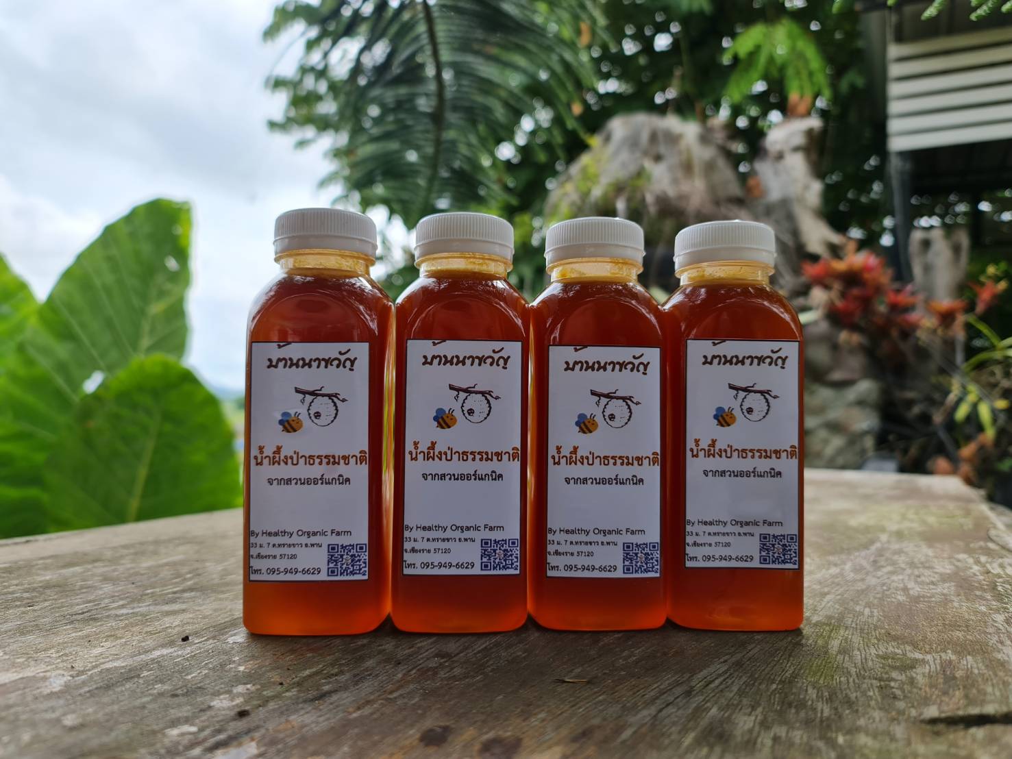 วินิการ์พร้อมดื่ม (Vinegar Mocktail) ของเรามีน้ำผึ้งเป็นส่วนประกอบด้วยนะคะ ซึ่งน้ำผึ้งที่เราได้มาจากน้ำผึ้งในฟาร์มบ้านนาขวัญเองค่ะ เนื่องจากเราเป็นฟาร์มออร์แกนิค ไม่ทำลายระบบนิเวศน์ของแมลง จึงเหมาะแก่การที่ผึ้งจะมาอาศัยอยู่ โดยเราได้สร้างรังให้ผึ้งได้เข้ามาอาศัยและดำเนินชีวิตของตัวมันเองไปตามธรรมชาติ ผึ้งก็จะออกไปหาเกสรจากดอกไม้ในป่าละแวกใกล้เคียงเพื่อนำกลับมาสะสมยังรังของผึ้งเอง เมื่อนานวันเข้าน้ำผึ้งก็มีมากพอที่เราจะนำเอาน้ำผึ้งออกมาในช่วงเดือนห้า ซึ่งน้ำผึ้งเดือนห้าเป็นช่วงที่เกสรดอกไม้มีมากที่สุด ทำให้ผึ้งนำเกสรดอกไม้มาสะสมยังรังเพื่อเป็นน้ำผึ้งได้มากที่สุดและมีรสชาดที่ดีที่สุดเช่นกันค่ะ