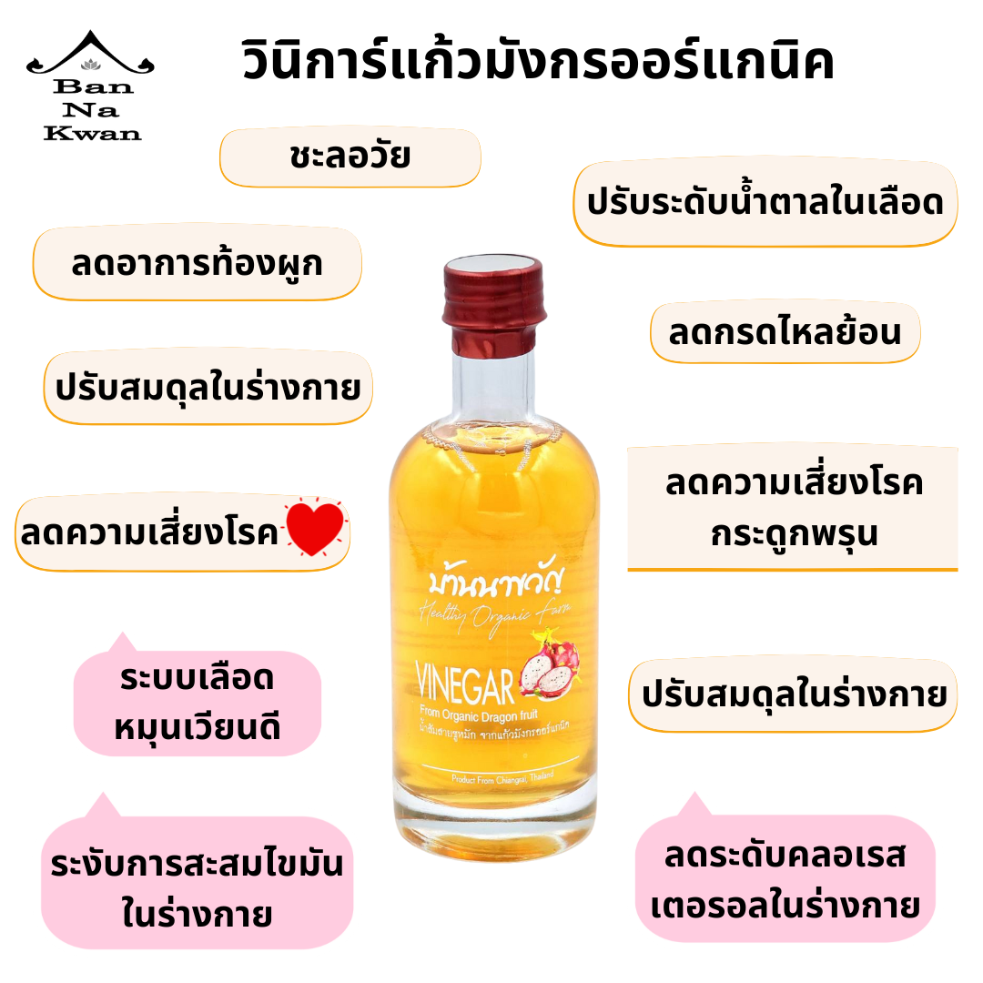 วินิการ์ บ้านนาขวัญ (ฺBannakwan Vinegar) ทำจากแก้วมังกรออร์แกนิค (Organic Dragonfruit Vinegar) ซึ่งเราได้ปลูกขึ้นเองตามวิถีพืชเกษตรอินทรีย์ ได้รับการรับรองออร์แกนิค PGS ORGANIC จากมูลนิธิเกษตรไทย เมื่อมีการเก็บเกี่ยวแก้วมังกรออร์แกนิคที่บ้านนาขวัญในช่วงปลายๆปี ก็จะนำมาแปรรูปเป็นวินิการ์ (Vinegar) แก้วมังกรออร์แกนิคที่โรงงานแปรรูป บจก.เฮลท์ตี้ออร์แกนิคฟาร์ม ภายใต้แบรนด์ "บ้านนาขวัญ" (ฺBannakwan)